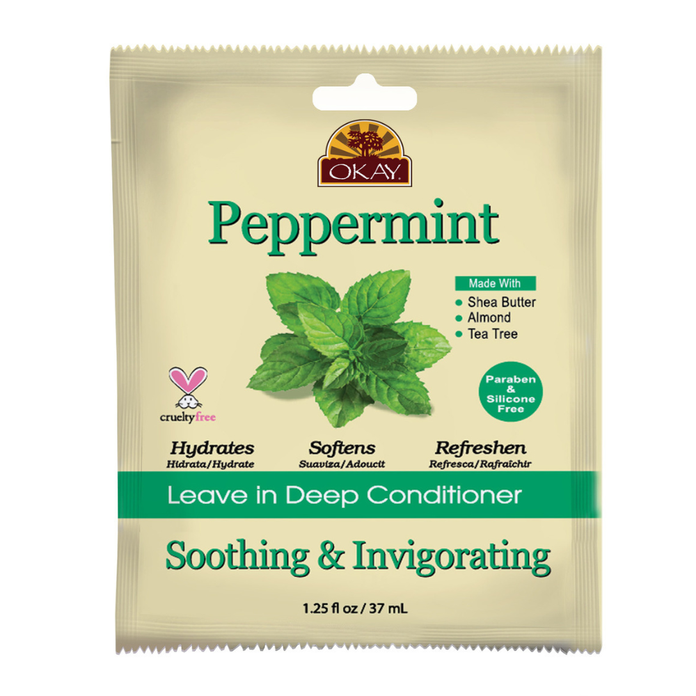 El acondicionador sin enjuague OKAY, tiene una textura cremosa ideal para aplicarlo de medios a puntas y masajear con suavidad, con un delicioso aroma a menta que refresca el cuero cabelludo y alivia el picor y la resequedad, mientras repara las puntas dañadas.