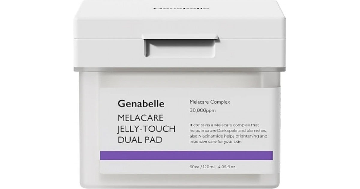 Genabelle Melacare Jelly-Touch Pads: Almohadillas de doble cara con 30,000 ppm de complejo Melacare que exfolian e hidratan para reducir manchas oscuras y unificar el tono. El lado de gasa limpia suavemente, mientras que el lado gelatinoso actúa como mascarilla hidratante. Ideal para una piel más luminosa y uniforme.