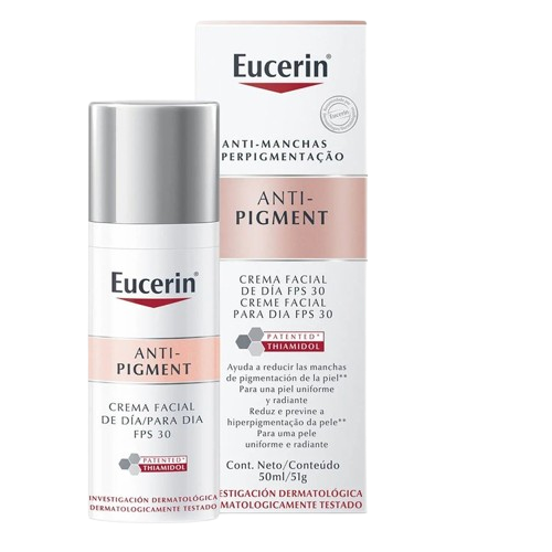 La Eucerin Crema Hidratante de Día Anti-Manchas con Thiamidol y protección solar UVA/UVB (FPS 30) está diseñada para proporcionar una piel más uniforme y radiante. Su fórmula con Thiamidol, un ingrediente patentado que reduce la producción de melanina, ayuda a disminuir y prevenir las manchas oscuras, con resultados visibles en tan solo 2 semanas. Esta crema, probada clínicamente y dermatológicamente, protege eficazmente contra la radiación solar, reduciendo las posibilidades de que la piel desarrolle manchas por exposición al sol. Además, mantiene la piel más suave y uniforme con el uso regular. Modo de uso: Aplicar por la mañana sobre el rostro, cuello y escote limpios, masajeando suavemente. Evitar el contacto con los ojos y no exceder las 4 aplicaciones diarias de productos con Thiamidol.