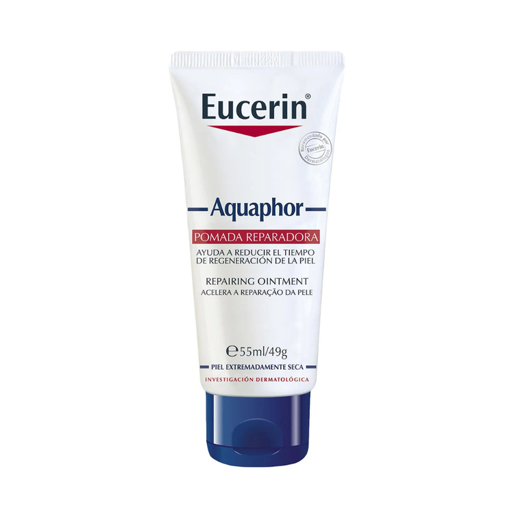 Aquaphor Pomada Reparadora de Eucerin promueve la cicatrización y regeneración de la piel irritada o dañada en bebés, niños y adultos. Formulada con pantenol, bisabolol y glicerina, es suave, libre de alcohol, colorantes, fragancias y conservantes, además de ser no acnegénica y no comedogénica. Su textura sin agua crea una barrera semi-oclusiva que permite la circulación de vapor de agua y oxígeno, fortaleciendo la barrera protectora natural de la piel. Ideal para piel seca, muy seca, agrietada e irritada. Aplicar según sea necesario en áreas afectadas, evitando heridas abiertas o húmedas.
