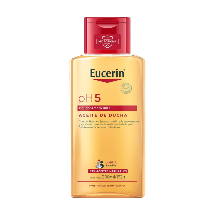 Eucerin pH5 Aceite de Ducha está diseñado para piel sensible, limpiando suavemente sin resecarla. Su fórmula con buffer citrato pH5 y surfactantes extra suaves protege las enzimas naturales de la piel, ayudando a mantener su equilibrio y evitando irritaciones. Proporciona una hidratación intensiva, dejando la piel suave y sedosa. Además, es libre de jabón, parabenos y colorantes, y está dermatológicamente probado para ser adecuado para pieles sensibles. Se recomienda usarlo diariamente y en combinación con otros productos hidratantes de la línea Eucerin pH5.