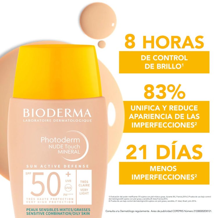 Protección solar facial con acabado natural. Bioderma Photoderm Nude Touch SPF 50+ tono muy claro para piel mixta a grasa. Control de brillo y unificación. Muy alta protección solar UVA/UVB, Mitifica la piel durante 8 horas, Unifica y corrige ligeras imperfecciones., Fórmula ligera, no comedogénica y resistente al agua, Previene el foto envejecimiento cutáneo.